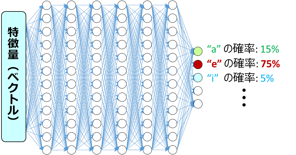 音声認識では、このDNNを「分類器」として利用しています。ハイブリッド型・End-to-End型ともに、入力は音響分析によって得られた音声の特徴量です。DNNはその特徴量がどの音っぽいか(ハイブリッド型では音素単位、End-to-End型では文字や単語単位)を判定し、その確率を出力しています。