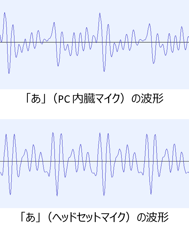 例えば同じ「あ」という音であっても、音声の波形は話者の性別・年齢、録音するマイク等によって変わります。以下の画像は、私が「あ」と発話したものをノートパソコン内蔵のマイクとヘッドセットマイクでそれぞれ録音した際の波形を示したものです*1。