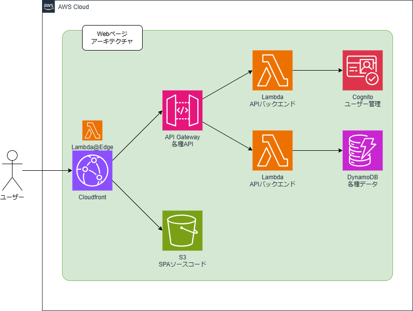 一般的な構成と違う点は、CloudFrontの下にAPI Gatewayがいることでしょうか。