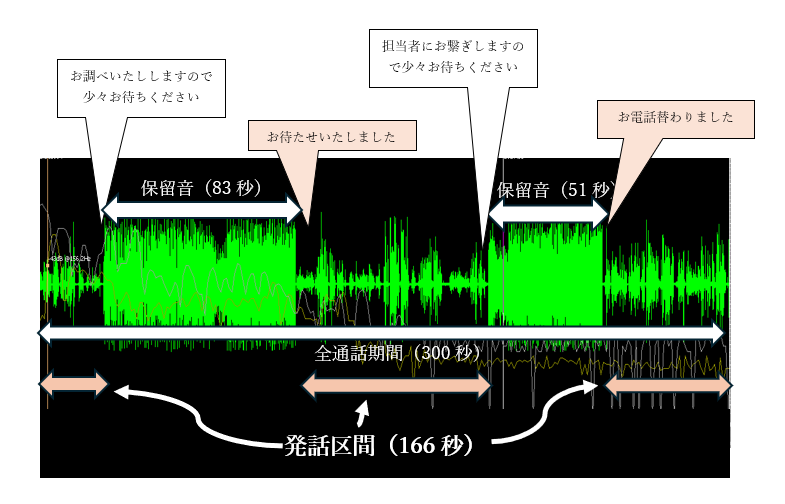 この音声で注目すべきは保留音区間。5分の通話中に2回の保留。うーん結構待っているね。