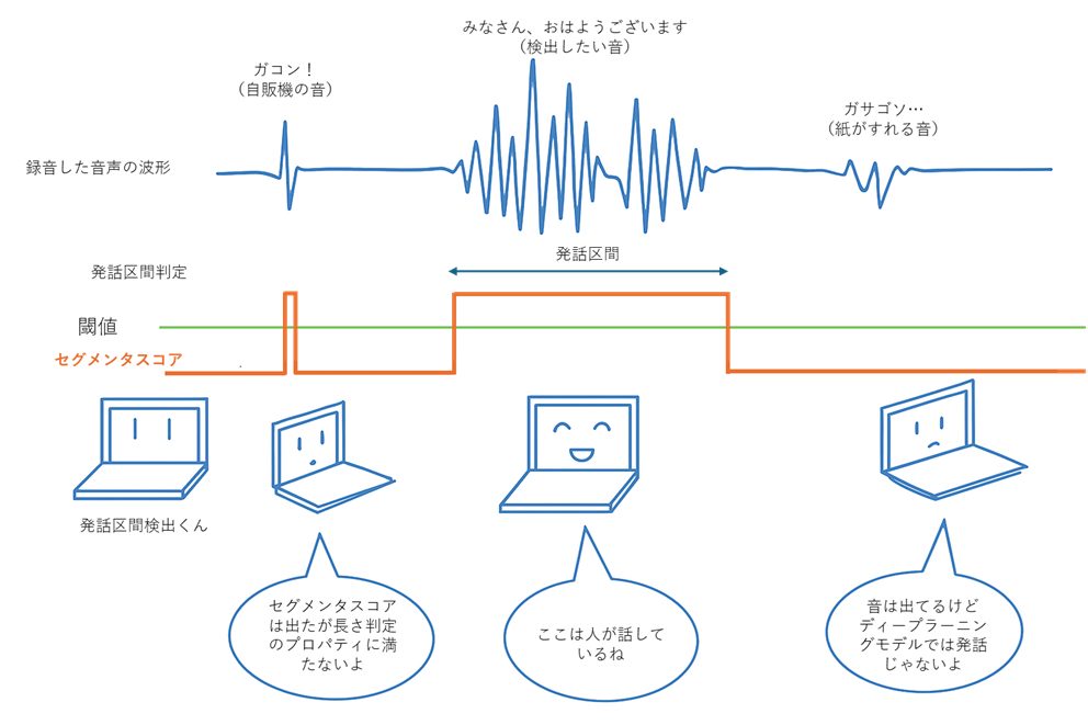 ディープラーニングモデルを通して出力されるセグメンタスコアと、設定されているプロパティに基づいて、発話区間の検出開始・検出終了を決定します。