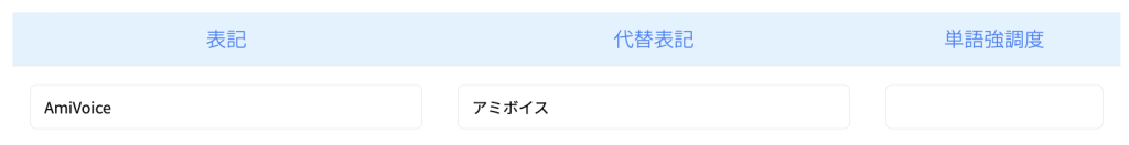 例えば、アミボイスという単語を登録しても認識されず、「亜魅母威酢」のような誤認識をしていると仮定します。このとき、代替表記に「亜魅母威酢」を登録するイメージです。