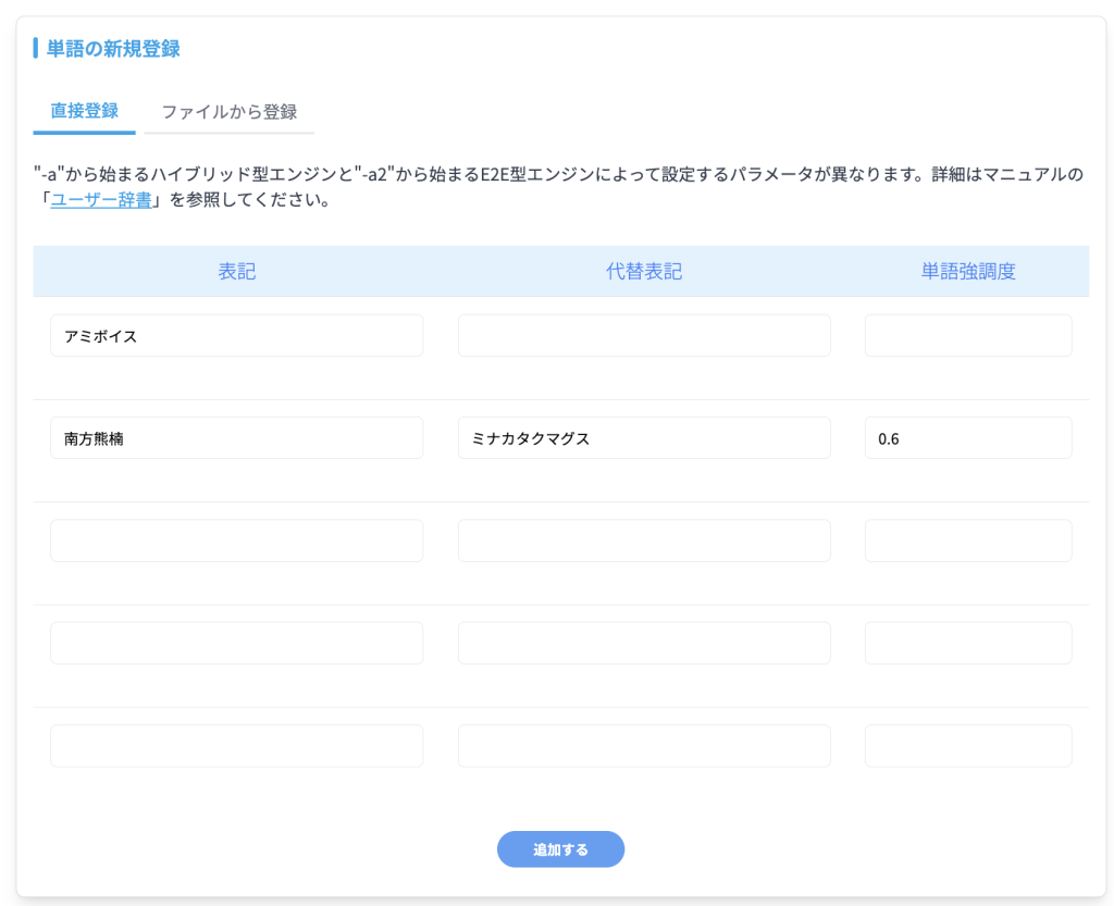 https://docs.amivoice.com/amivoice-api/manual/engines/#difference-between-end-to-end-and-hybrid ↩︎ - 今回のリリースに伴い、このような機能の総称をユーザー辞書登録と改めました。ハイブリッド型の「単語登録」とE2E型の「単語強調」をまとめてユーザー辞書登録と呼称します。 ↩︎