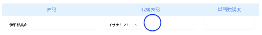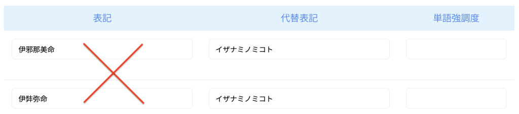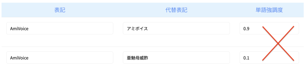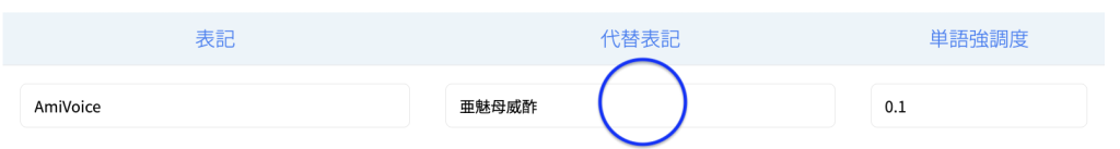 例えば、アミボイスという単語を登録しても認識されず、「亜魅母威酢」のような誤認識をしていると仮定します。このとき、代替表記に「亜魅母威酢」を登録するイメージです。