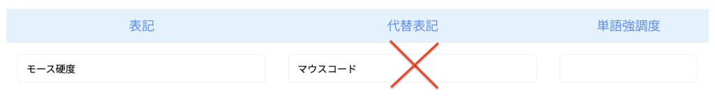 たとえば「モース硬度」が「マウスコード」と誤認識されるときに、マウスコードを代替表記に設定してしまった場合を考えてみましょう。この時、実際にマウスコードと発話してもモース硬度という認識結果になってしまいます。