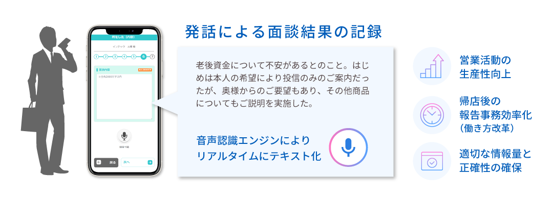 By linking with the CRM (Customer Relationship Management) function of "F3 (F-Cube)," a comprehensive information system solution for financial institutions, it is now possible to easily create interview records with customers. Voice recognition is used for input. Previously, sales representatives would register interview records on their in-house computers after returning to the branch, but with this function, they can now register interview records by voice from their business smartphones even when they are out and about.